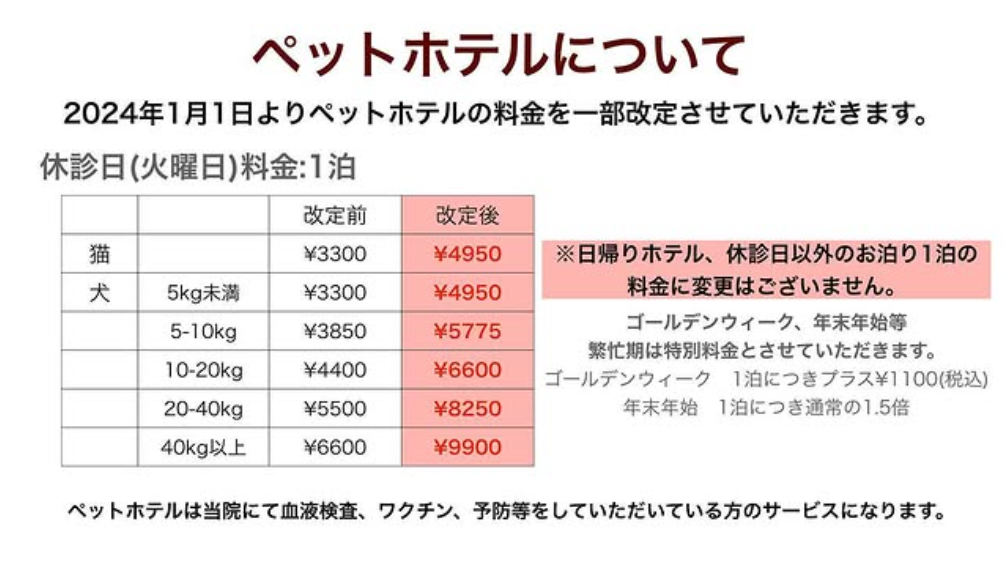 2024年1月1日からペットホテルの料金を一部改定させていただきます。 ホテルご利用時、火曜日(休診日)を挟む場合は、火曜日のみ特別料金とさせていただきます。 日帰りホテル、火曜日以外のホテル1泊の料金に変更はございません。また、繁忙期も特別料金と... -