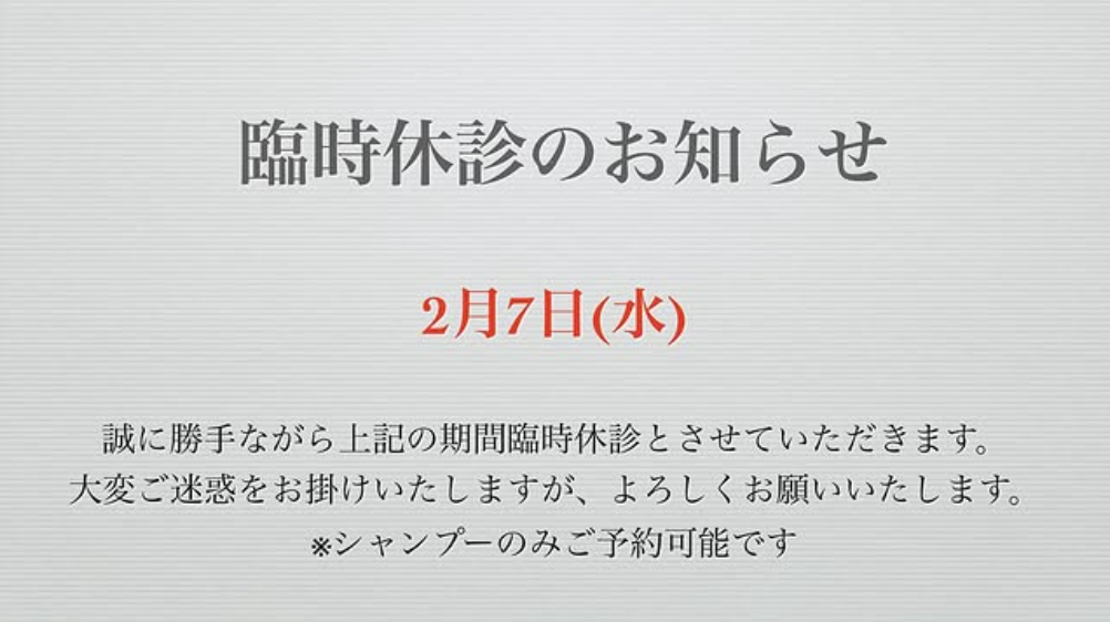 誠に勝手ながら2月7日(水)は臨時休診とさせていただきます。大変ご迷惑をお掛けいたしますがよろしくお願いいたします。 シャンプーのみご予約可能です。 -