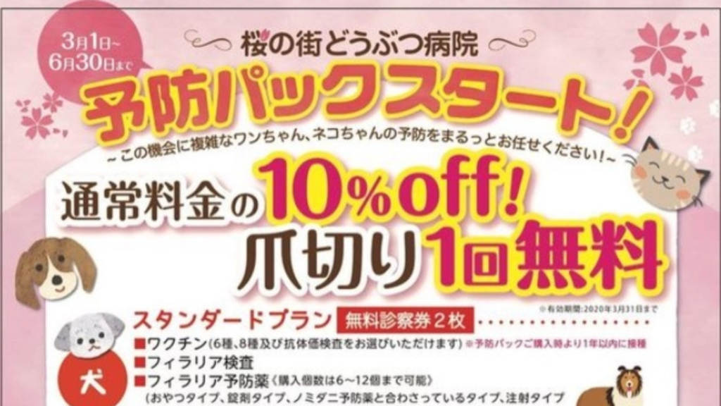 ①3/31まで爪切り1回無料です‼️毎月の爪切りが今月は無料でできちゃいます✨ワンちゃん、ネコちゃんどんな子でもどうぞ☺️②3/1から6/30まで春の予防セット10%オフ‼️フィラリア、ノミダニ、混合ワクチン、血液検査、診察無料券(2回分)がセットになってお得に... -